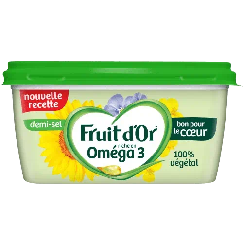 Fruit d’Or Oméga 3 et 6 sans huile de palme, doux ou demi-sel, est l’allié idéal en tartine, en cuisson ou en pâtisserie. Il est aussi délicieux en cuisson ou fondu sur un plat chaud. Découvrez des idées recettes ici !