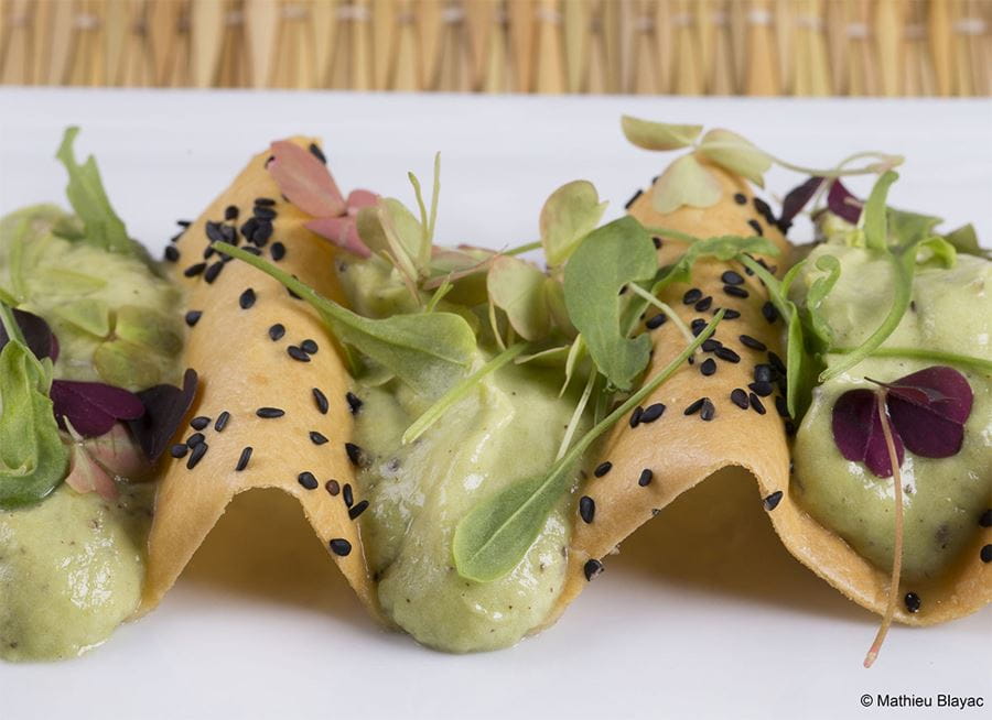 Tacos de socca, avocat et kiwi à la margarine et aux sésames torréfiés
